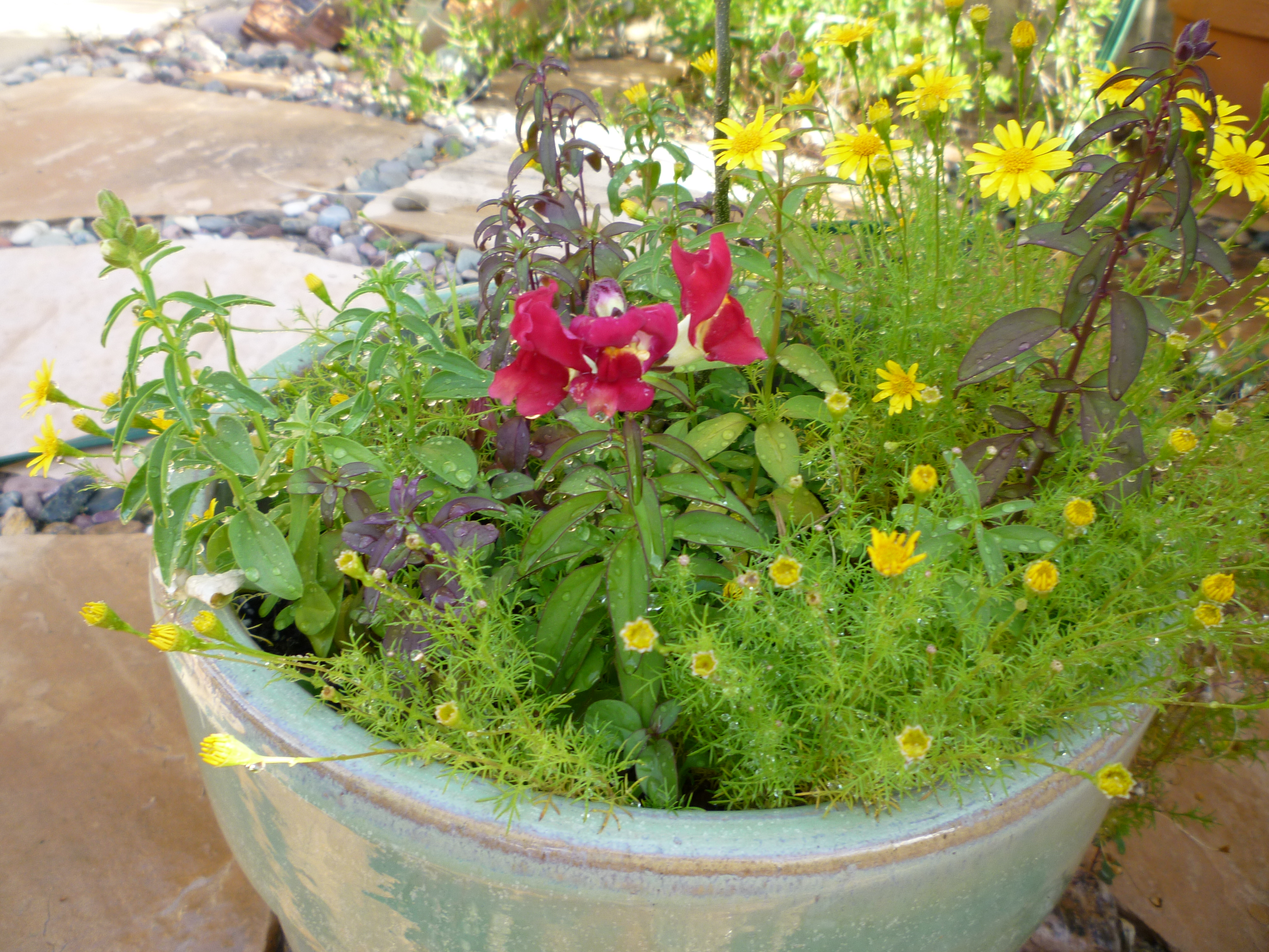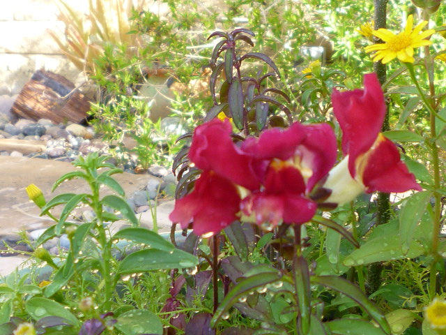 A flurry of these things popped up in the El Niño rains this spring. I thought they were weeds and was about to extirpate them, but the seedlings are so pretty I relented and decided to see what they’d do. As fresh young babes, they have striking foliage: deep green trimmed in red. Here’s some that volunteered between the flags in the courtyard.