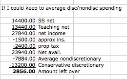 A miracle has  happened: January and February expenditures came in well under budget. On average, I figure to spend $657 a month for nondiscretionary bills (factoring in the high summer utility bills with correspondingly tiny winter ones) and about $1200 for things I have some control over. Total budgeted for day-to-day expenses: $1857/month.