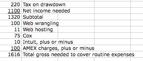 Last night I calculated what I would need to pay myself a salary and cover all the business’s overhead, not counting occasional computer purchases. It looks like this: