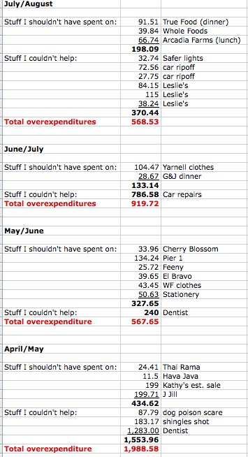 This summer, overspending on optional things, like socializing with friends in restaurants and buying clothing, shoes, and baubles, has averaged $283 a month. Average forced overspending on things that can’t be put off, such as dental procedures and car repairs, has been $622 a month. Think of that: on average, I’ve run $905 over budget, all summer long.