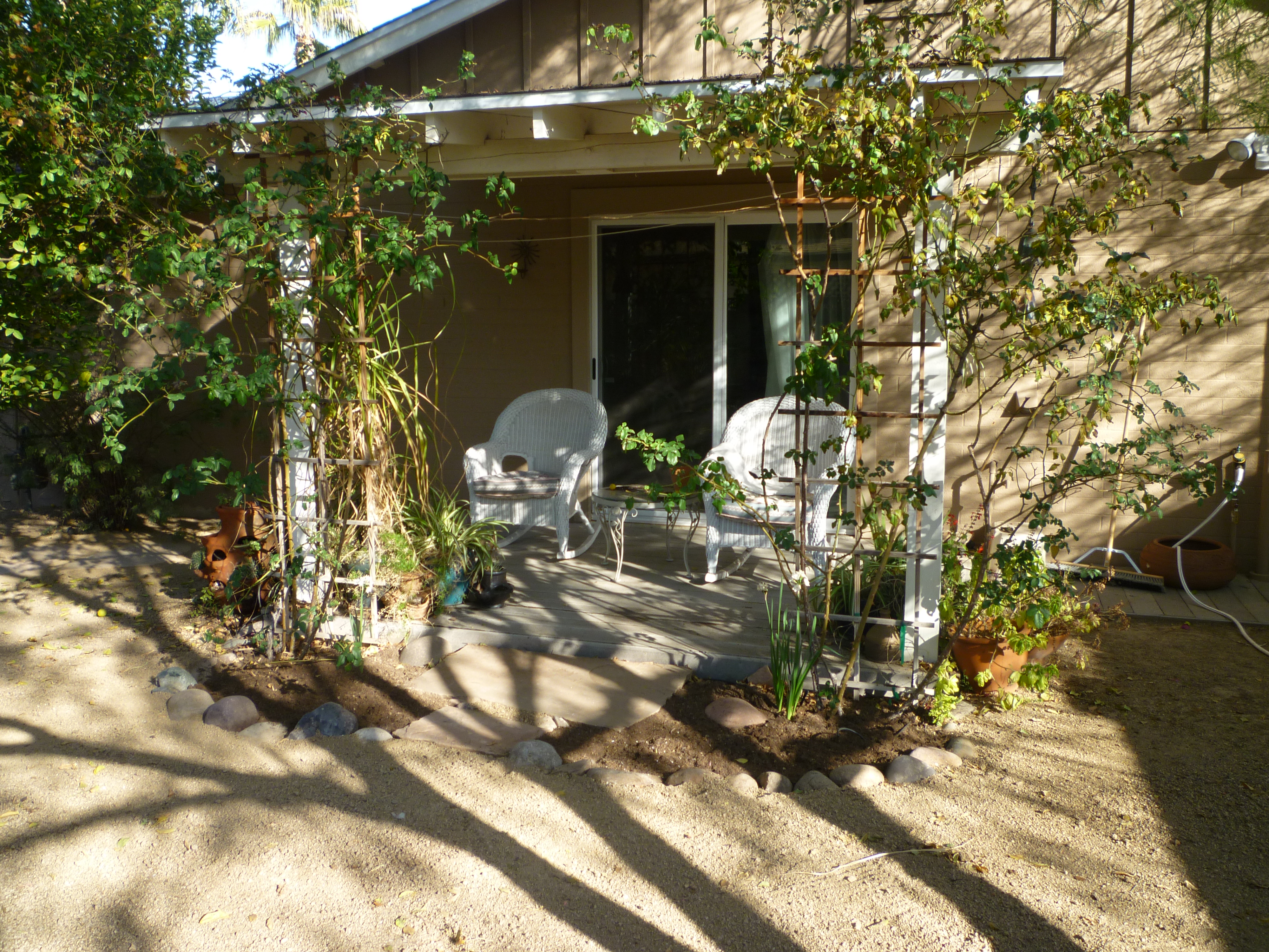 🙂 Found that piece of flagstone buried under the crushed granite. Next time I’m at Baker’s or Summerwinds, I’ll look for a kitsch frog or some such to set on there. Though I have a Talavera frog pot with a cactus in it, Gerardo’s underlings invariably break anything made of pottery that’s left in their way. Baker’s sells molded resin turtles that are amazingly lifelike, and of course cast frogs are a dime a dozen.
