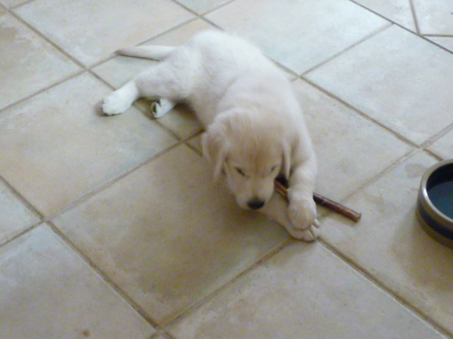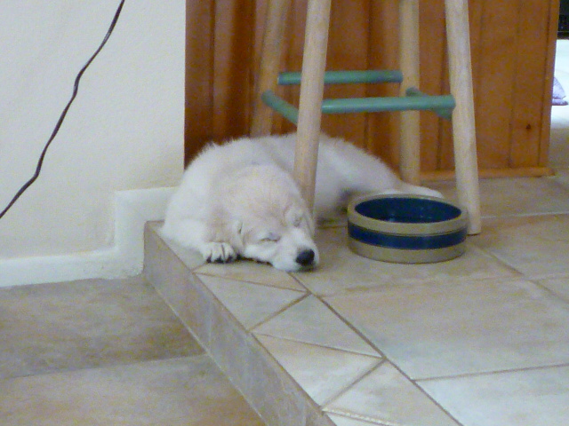 Meanwhile, the puppy yaps, the puppy finds the paperwork for the mortgage on the downtown house and decides to eat it, the puppy pees on the floor, the puppy grabs Cassie and gets walloped, the puppy does dances to puppy joy, the puppy evinces starvation every 30 minutes and has to be fed, the puppy digs a hole under a citrus tree, the puppy grabs Cassie’s Angry Bird out of her mouth and bounces away with it, the puppy has a gay old time. During this celebrating, I have to make my way through a Chase Bank phone maze to find out why they’re charging me a $132 redemption fee because I canceled their damn card. The puppy eats the mortgage documents while I’m on the phone to one Hrothgar or whatever the hell his fake name is. Hrothgar opines that the “redemption fee” is really money they owe me, and that they’re going to send it along to me. Any day now.