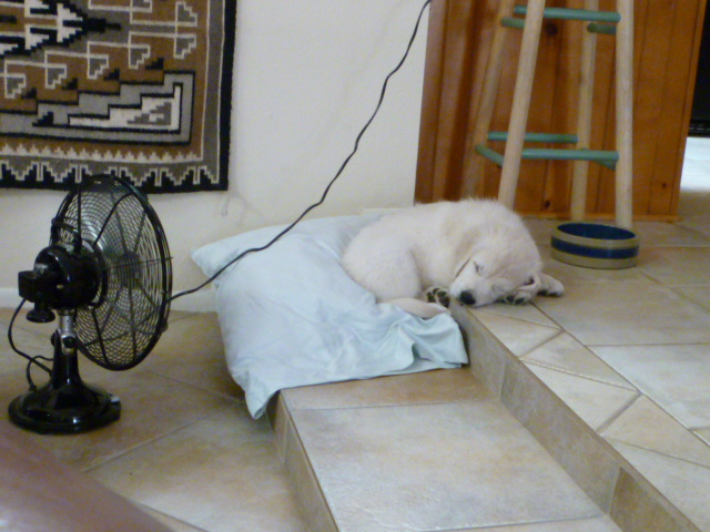 The dinner having cooked itself and been consumed, I just stuck my head back out there. Temp is down to a chilly 88. Air is muggy. The wind is scented with the perfume of creosotebush, a beautiful smell like…rain. We’ve had some restive thunder—the Cassie hates that. And now I’m about to clean up the kitchen and go see if anything’s on the TV at 8:00 of a Thursday night. Probably not, but nothing ventured….