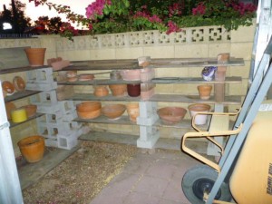 As it develops, Gerardo and his sidekick haven’t been doing such a hot job on cleaning up the leaves and pods that sift down there every day from the devil-pod tree. They can’t be too severely blamed—I’ve left a great collection of broken pottery and other priceless collectibles laying around out there, to the extent that the place had begun to look like Dave’s Used Car Lot, Marina, and Weed Arboretum. Old leaves and bougainvillea flowers were packed tight under the boards that form the lowest b&b “shelves,” partly because you couldn’t easily walk around the junk back there to get at the mess.