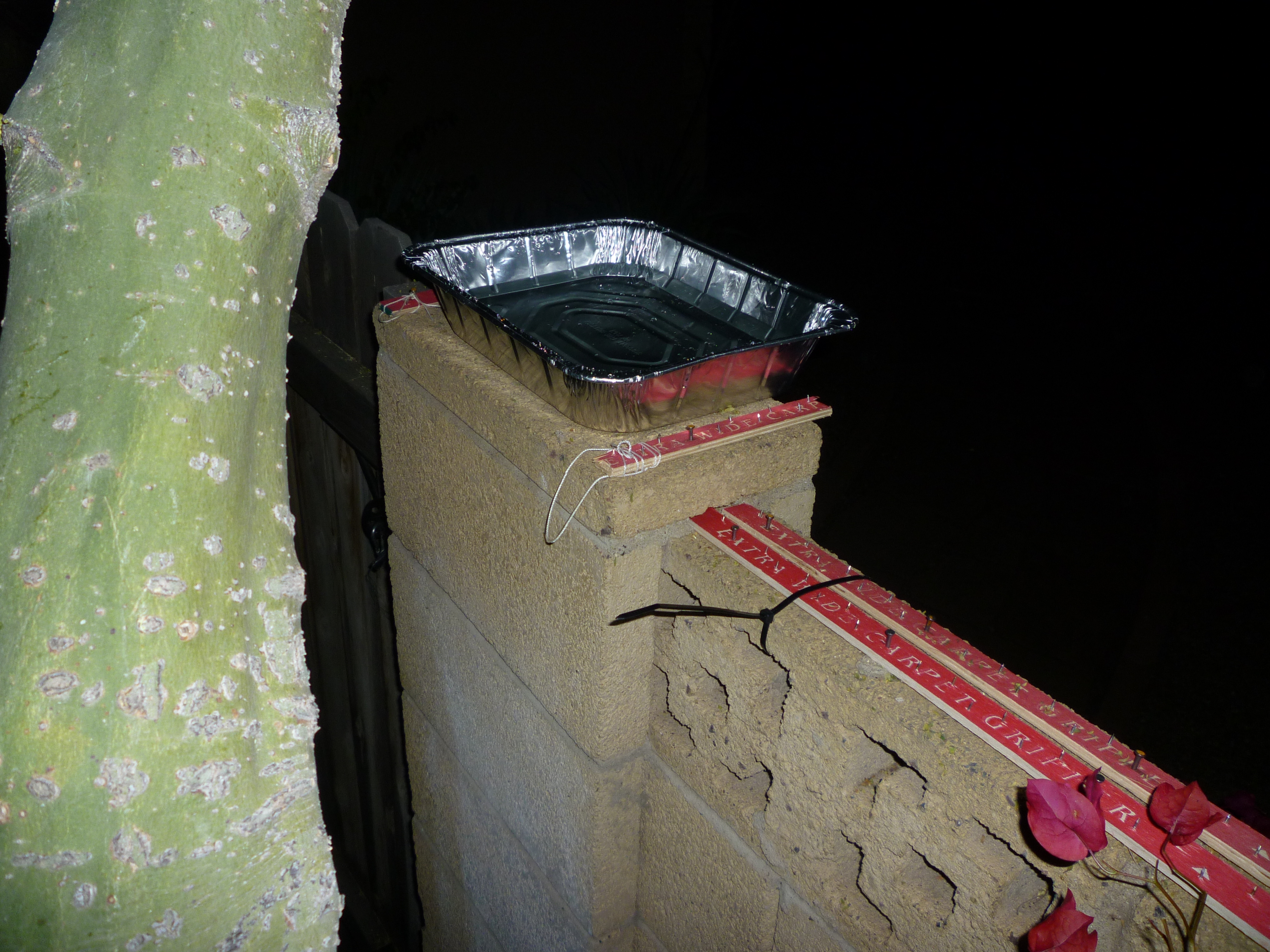 Caldrons of boiling oil! Or, in cat lexicon, about the equivalent: water! Lurking in the garage is a lifetime supply of cheap aluminum steam-table liners…perfect for roasting dog meat on the grill. It dawned upon me that these things are just about the size of one of those capstone blocks. If one were to half fill it with water and set it atop the column, the thing would fall on the cat the first time the damn cat tried to jump up there.