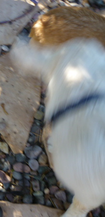 ….and didn’t even find enough to finish that sentence: Puppy barked to go out (and is now doing…what?). While out, he had to try to excavate the paloverde tree; then, back indoors, had to gouge some new claw-tracks into the kitchen cabinetry…..