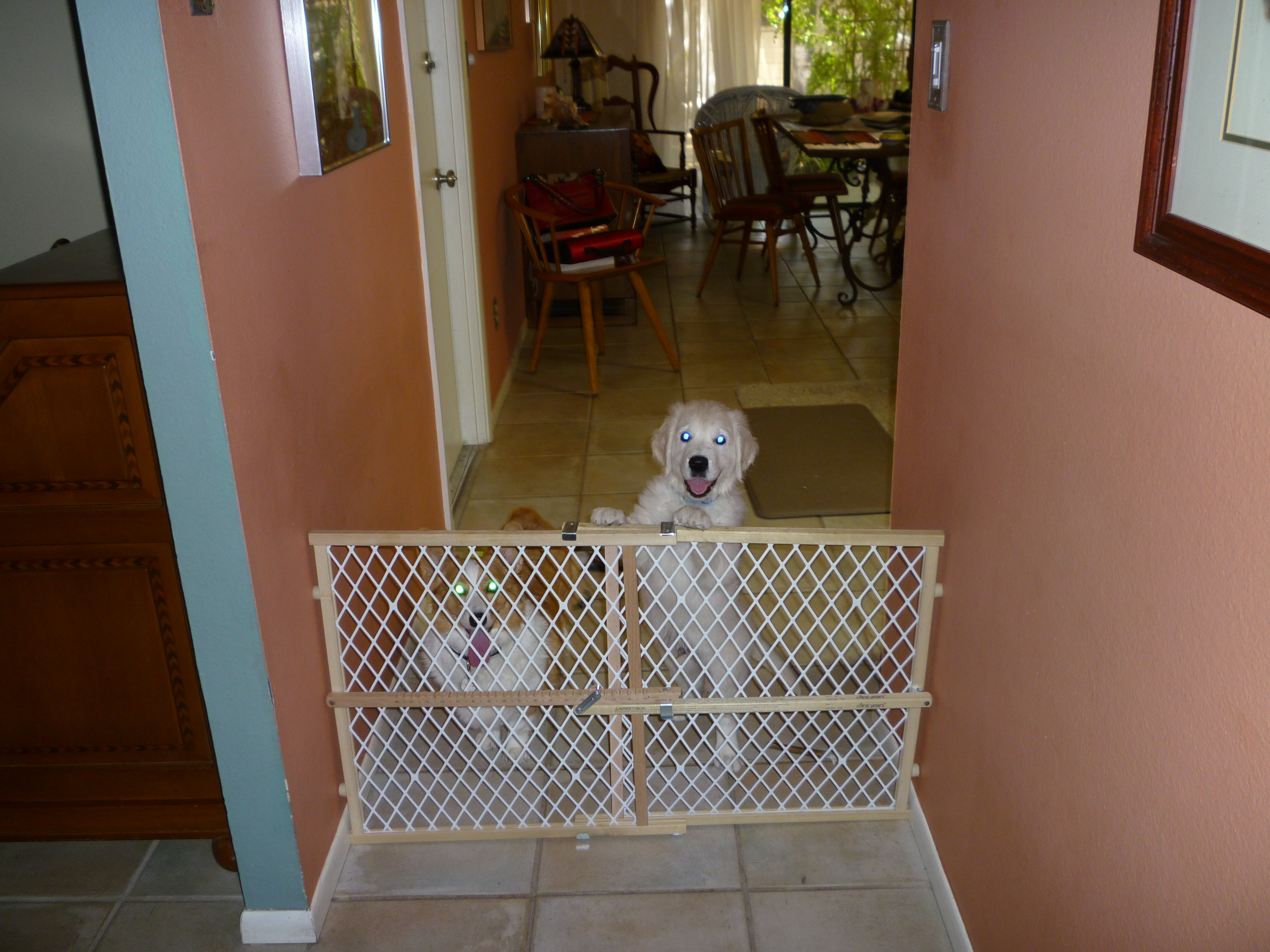 The Wednesday afternoon class let out a little early, giving time to race by the Safeway to pick up a celebratory bottle of wine and the pool store to pick up some chemicals. Then raced home to discover M’hijito had not come by over the lunch hour, and that left Charley caged and unfed for five hours. Opened the crate door, released a nuclear explosion. Fed the explosion some dog food. Chased around. Ran a second hose from the westside bibcock to the empty pool, turned it on full-blast to supplement the full-blast flow from the bibcock on the north wall. Chased around some more. Locked Cassie in a bedroom to protect her from pup’s turbocharged maleness. And on it went.