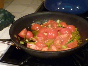 A tomato sauce containing a couple big cloves of garlic and the entire bunch of green onions…