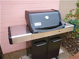 So Thursday M’hijito came over and helped wrestle the latest extravagant purchase out of the car, having agreed to do so in exchange for the opportunity to partake of the first meal cooked on the thing. He hauled the big charcoal grill off the pad I want to use for cooking and over to the ad hoc flagstone patio(?) I built some time back, and then positioned the new gas grill in the desired spot.