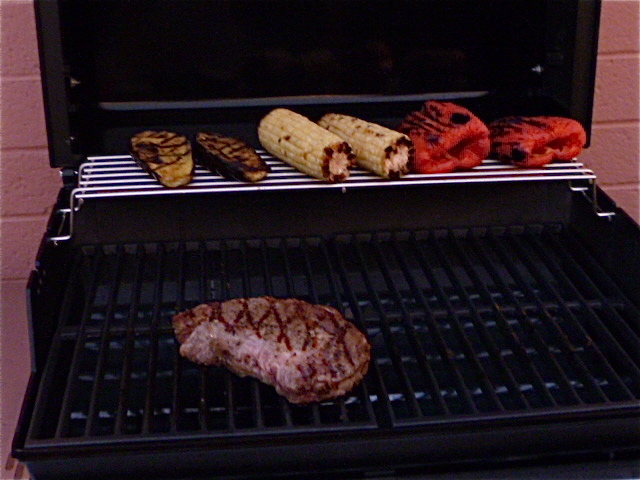 …And an exuberantly garlicky lemon vinaigrette that we used for cooking. M’hijito carved out the stems and seeds of a couple of red peppers and then poured some of the vinaigrette into the interior. These went onto the grill along with a small eggplant (also basted with the garlic vinaigrette) and a couple cobs of corn.