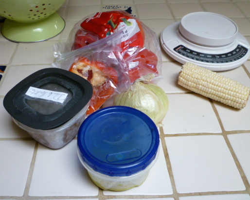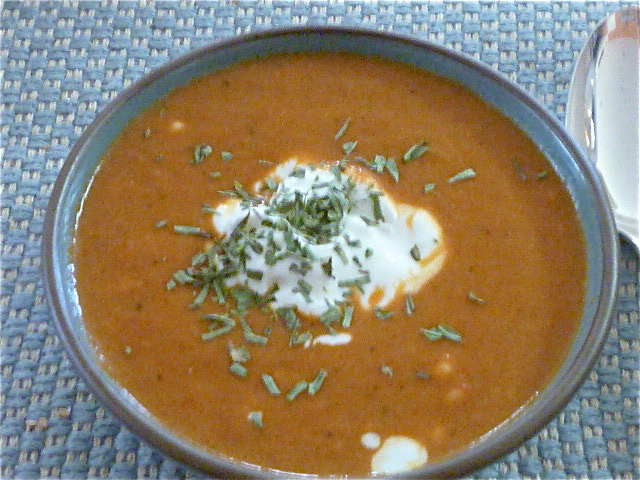 Nothing would do the other day but what I had to shovel out the fridge and use some of the lifetime supplies of Costco produce before it spoiled. Three and a half bright red bell peppers and one cob of fresh sweet corn surfaced among the loot. Out of curiosity, I decided to try making a red bell pepper soup.