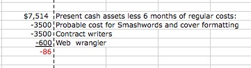Assuming The Copyeditor’s Desk retains its bread-and-butter client (never a safe assumption…but then, what is?), and assuming none of our efforts ever turns a dime, at the end of six months — on March 31 — we will almost break even: we’ll be $86 in the hole.