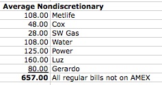 Based on 2014 figures, average monthly nondiscretionary costs come to about $657. That’s counting the housekeeper and the lawn guy as fixed monthly expenses.