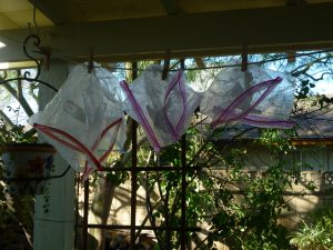 I wash and reuse my bags until they show signs of too much wear, too. Several years ago I bought a nifty rack that allows me to dry them easier than laying them on the counter. Sadly, I don’t have a clothesline here so that’s not an option. I also don’t run them through the washing machine, but they seem to get clean enough with my brush, dish soap, and hot water.