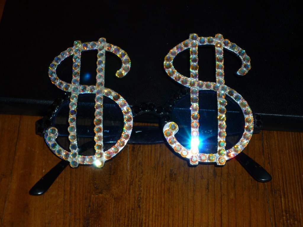 So. Obviously, any self-respecting Funny about Money fan needs a unique pair of sunglasses adorned with solid rhinestone dollar signs. And one lucky person will have them, free! Here’s the plan: