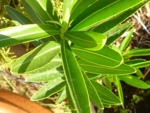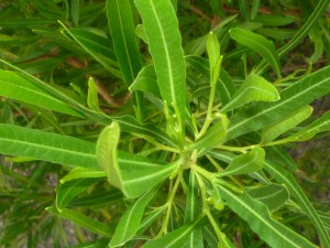 And speaking of the hopseed bushes, remember the “oleander” I reported as having volunteered in a pot? Well…hmmmm….
