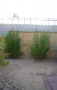 Those things are old tumble-down wooden trellises, to which I nailed old shade screen and then tied to the wall’s decorative block row. They also serve to block curious eyes from peering into my yard as I go about my business, often in various states of undress. Look just awful! But they’ll do the job until those hopseed bushes can get big enough to take over from the deceased devil-pod tree as a privacy screen.