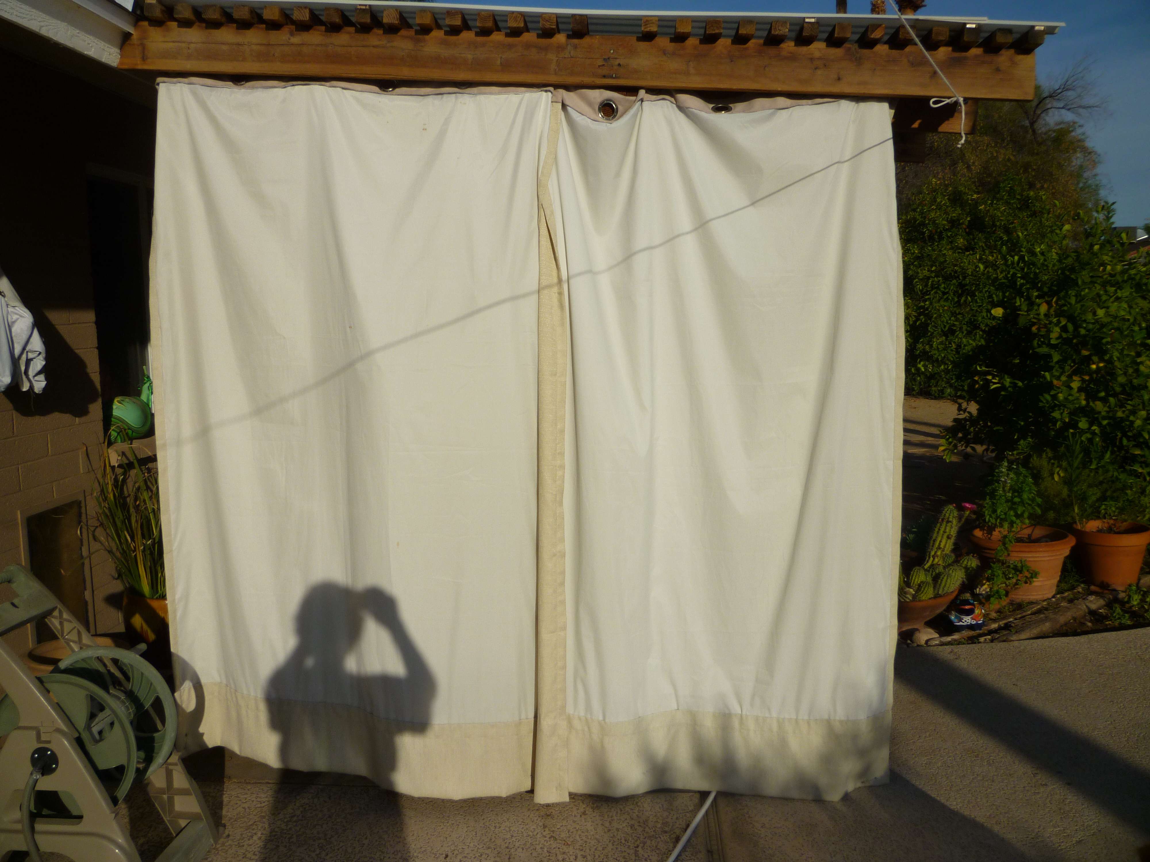 One nice thing about this lash-up is that it creates a kind of tent where I can shuck off my clothes and wrap a towel around myself to dart over to the pool without being observed from the neighbor’s front windows or by tall or nosy passers-by.