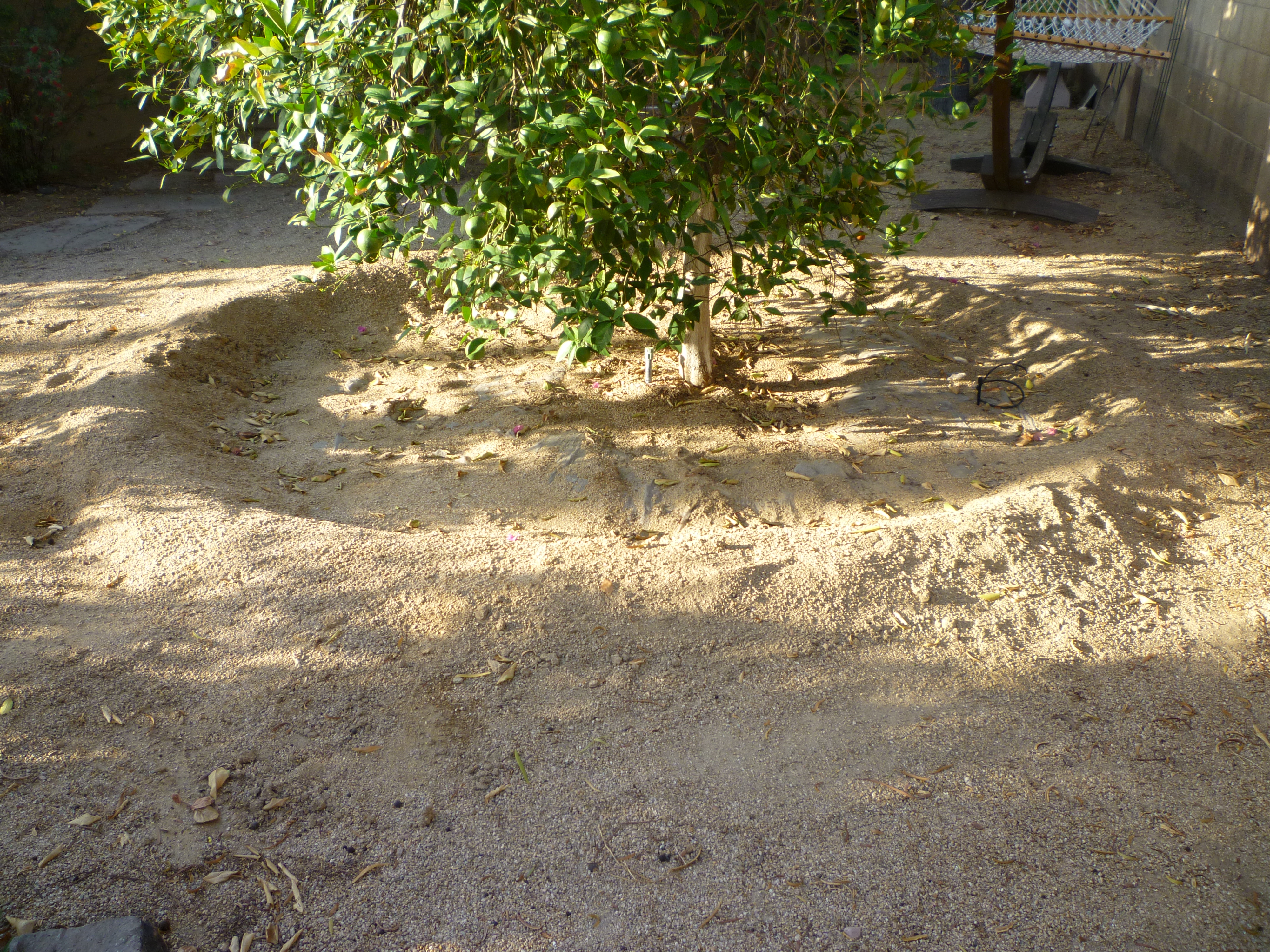So, I broke out the shovel and the hoe and, over three days, scraped the crushed granite back away from the tree, mounding it up to build a berm under the drip line. Really, it probably should be further out from the drip line than this, but that would make the side yard nonnavigable. Still need to get some river rocks to shore it up—otherwise the first hard rain (which, if we’re gonna get it, should come in the next month) will melt this fine moon crater back down to grade level.