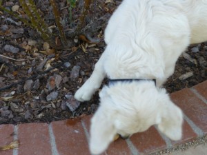 Oh…and there’s more. It turns out dogs like Brussels sprouts. Not only will certain golden retriever puppies scarf up pieces you carelessly drop on the floor, the stem makes an awesome chew stick for your pup! Charley, who’s now verging on 50 pounds and is sprouting (heh) all his adult teeth, made off with the thing and chewed at it for quite a while, until his attention wandered. He came back to it several times—never was able to pull it apart, and unlike other chew toys, it did not splinter or peel off pieces that might choke him.