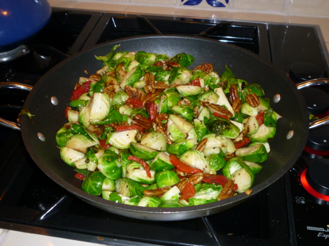 Skim the bottom of a frying pan with some olive oil and heat gently over medium to medium-high heat. If you’re using butter, add this, too, so it will melt into the olive oil. Add the pecans and stir them around for a few minutes to begin browning (don’t overdo this step). Then add the sprouts and herbs, stir well to coat with cooking oil and distribute herbs, and cook over medium-high heat until the veggies are nearing the “done” stage to your taste. IMHO, they’re best served al dente—still a little crisp. Shortly before you’re ready to serve, add the peppers and stir around so they will be warm and will add their flavor to the dish. Season to taste with salt and pepper.