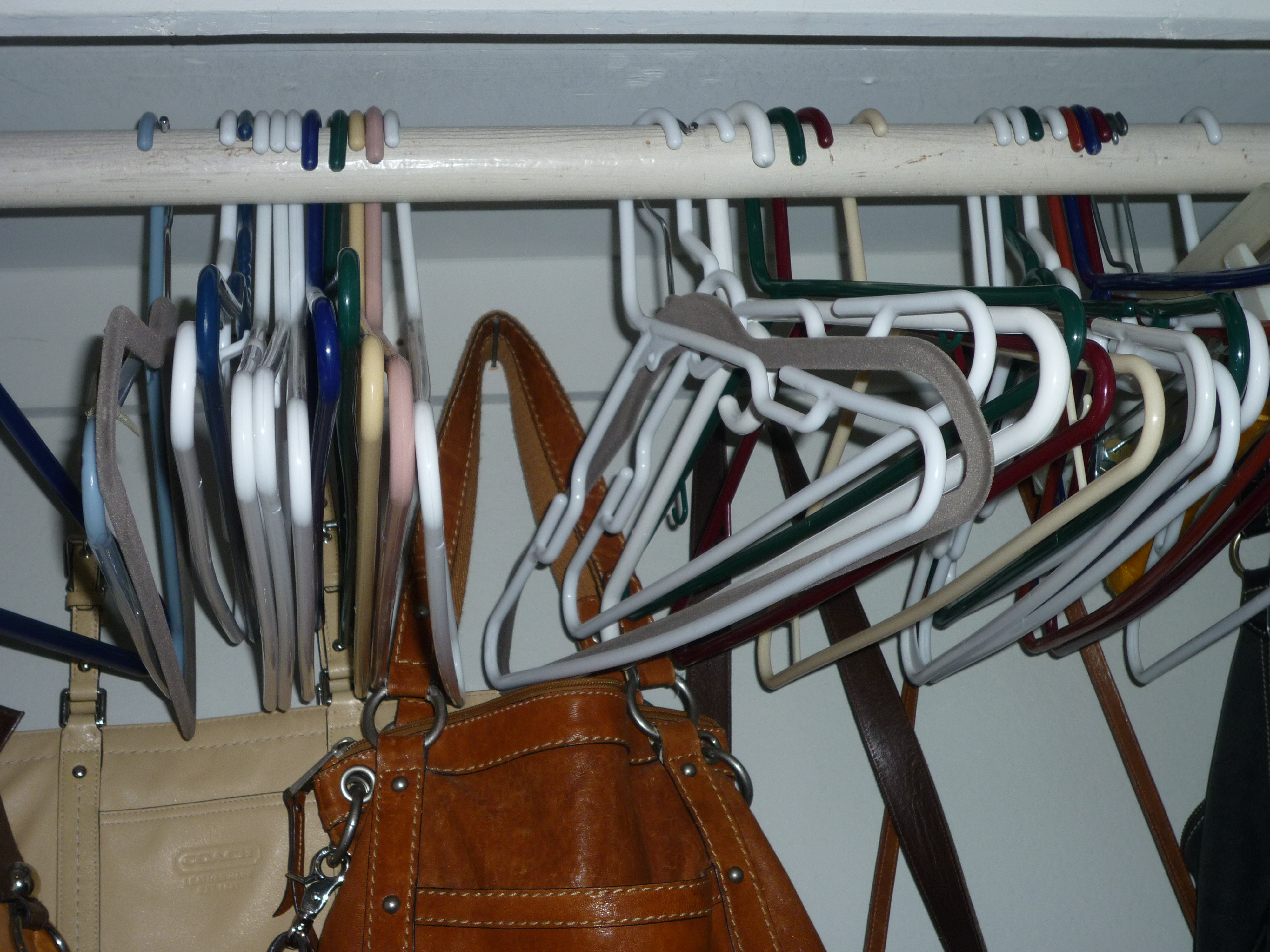 Spent part of the afternoon yesterday finally emptying out the closets, which have accrued old clothes as stale bread accrues blue mold. Threw out a bunch of tired stuff, moved the winter outfits to a closet in the other room, and gathered the summer stuff in the bedroom closet. In doing so, I freed up a vast number of clothes hangers, which before the cleaning frenzy were in short supply.
