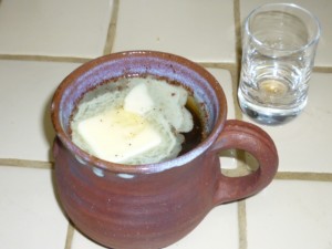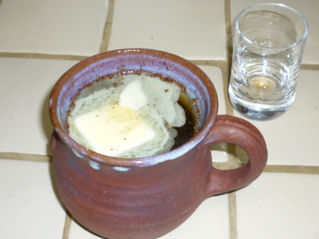 Once the water does come to a boil, fill the cup with hot water. Add a pat of butter (about a tablespoon, give or take).