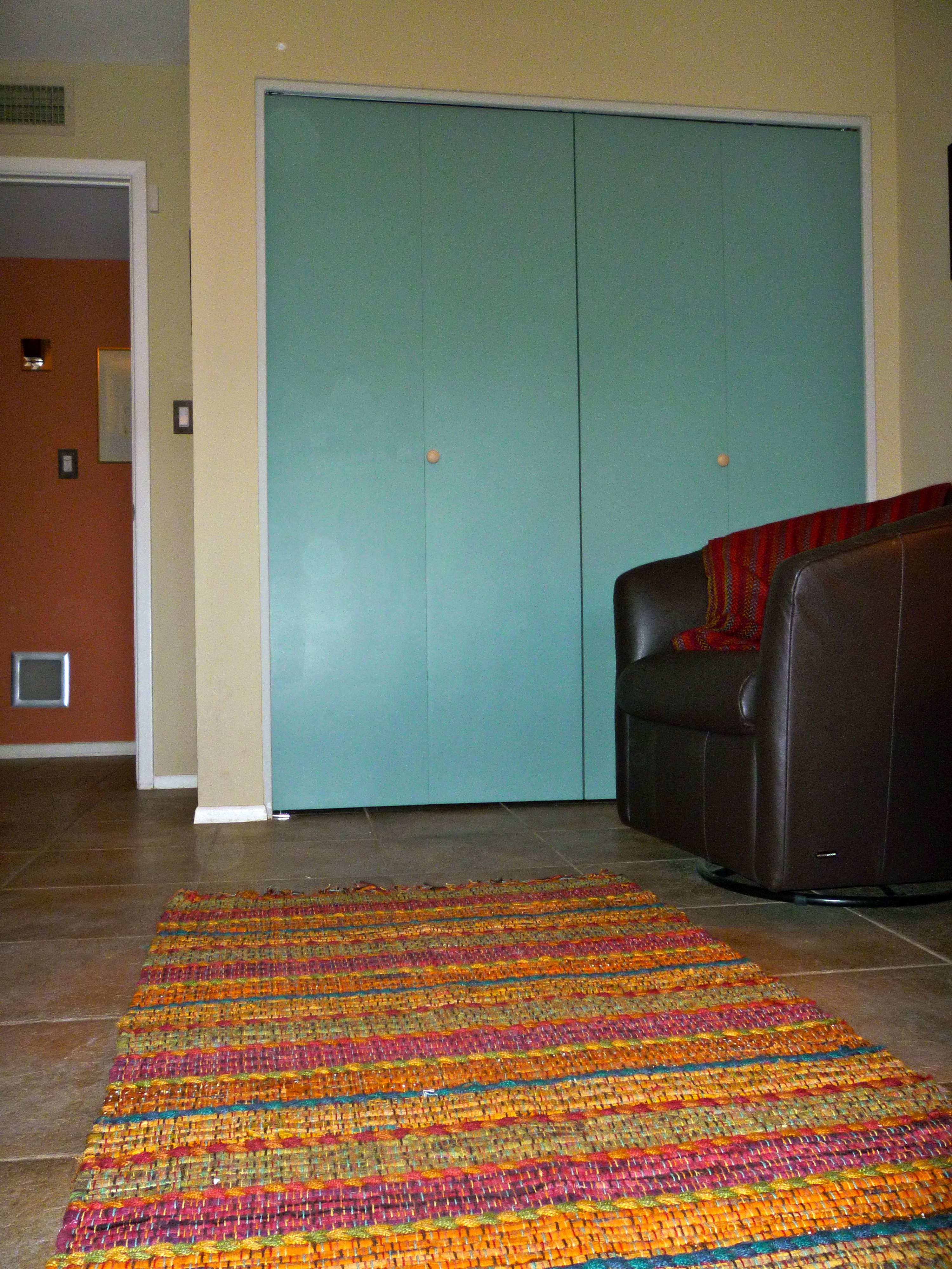 That room essentially functions as a hallway to the doggy-door and as storage. Off-season clothing goes in the closet, and the armoire that no longer holds a television set is full of bed linens.