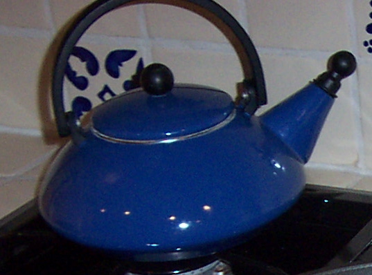 I loved that kettle. It was bright blue and pretty and it had a LOUD whistle that would call me back to the kitchen no matter how absorbed I was at the computer or how distracted with some hassle out in the yard. It was perfectly balanced so it was easy to pour even if it was overfilled, and its handle and the strange little whistle stayed cool even if it had been left on the stove a little overlong.