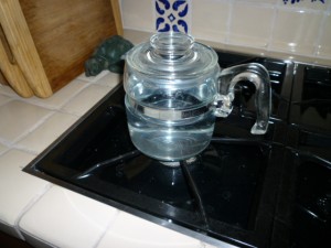 Never, ever let a stovetop percolator come to a full boil. The water does not have to boil for the percolator to perc. It only needs to come to a rather slow simmer. If you let it boil, you get battery acid. That’s why electric percolators make such horrid coffee. If you keep the heat low, you get incredible coffee.