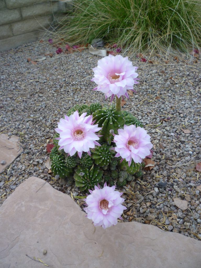 Speaking of the small delights in life, the pink Easter Lily cactus in front is blossoming untimely: