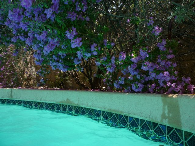 This is the plant that used to arch over the water, which I love because when the helicopter bastards fly over while I’m in the pool, I can swim in underneath it so they can’t eyeball me. One of the workmen decided NOTHING would do but what it had to be cut back, though, so he hacked off the sprays that bent over the edge and sometimes dipped into the water.