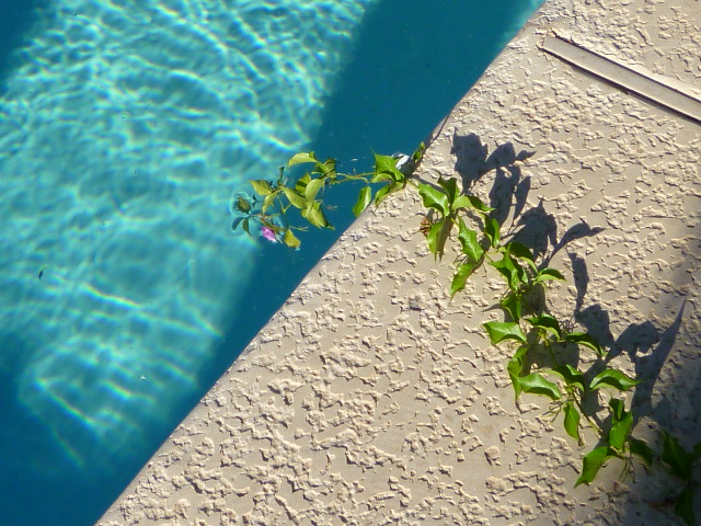The hanging garden that inhabits the back wall and adds about three feet to its height—quite spectacular at certain times of the year—has sent out a battalion of tendrils, which are marching steadily toward the pool. This one is especially bodacious. It’s grown about an inch a day, and today it made it into the water.