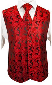 He buys himself the red-patterned jacket, a cumberbund, a bow tie, a vest, a pair of black slacks, and such like, racking up a handsome bill. All this, he pays for at the register with cash.