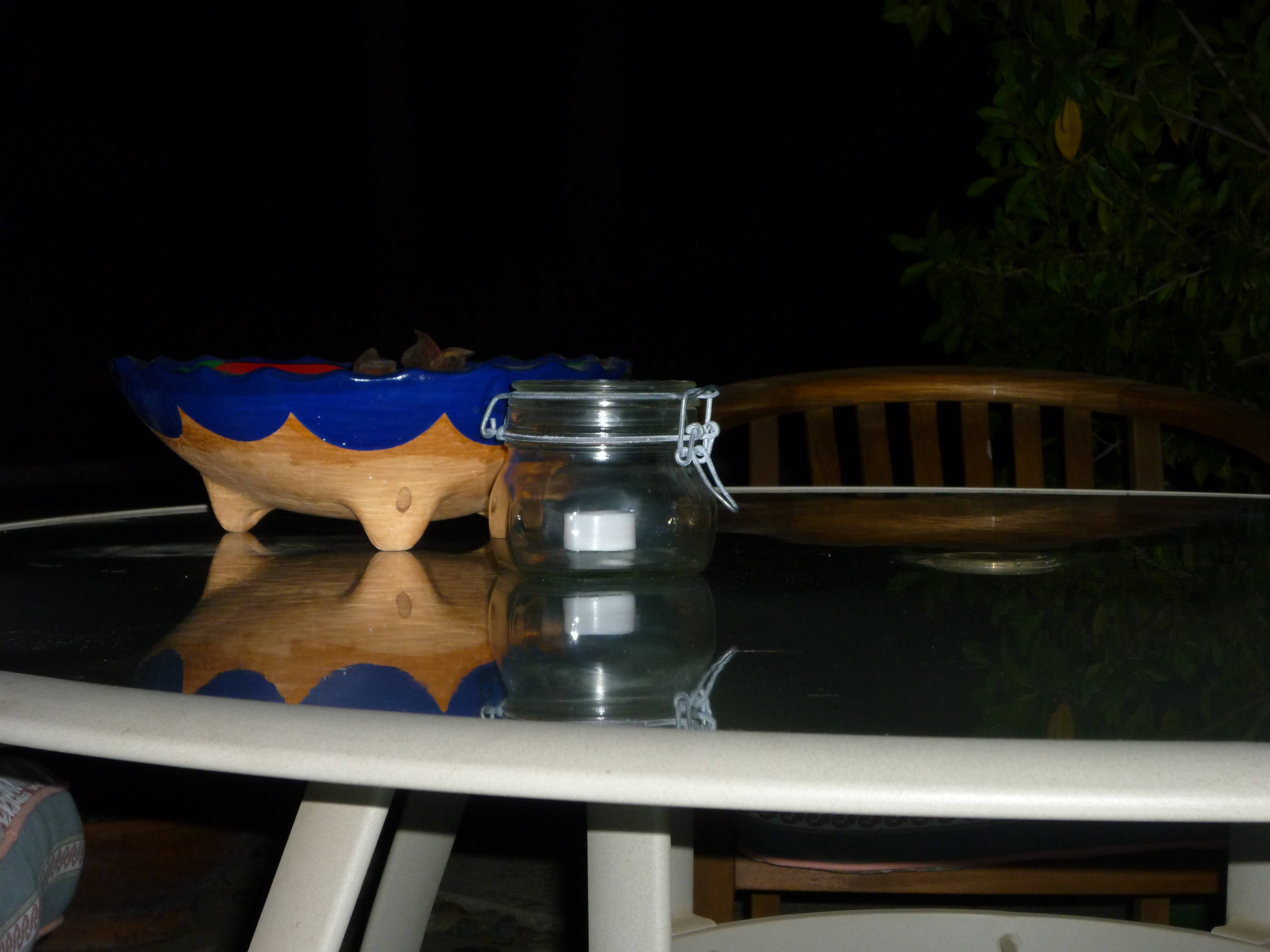 Intrigued by the possibilities, I put one in a glass Kosta Boda tea light holder. The LED is a little dim for authenticity, unless the room is completely dark. Then I came up with the idea of setting it in a short French canning jar. Because the jar’s thick, curvy walls distort light, the thing looks amazingly like a real tea candle sitting in there! Perfect for the table on the back porch: