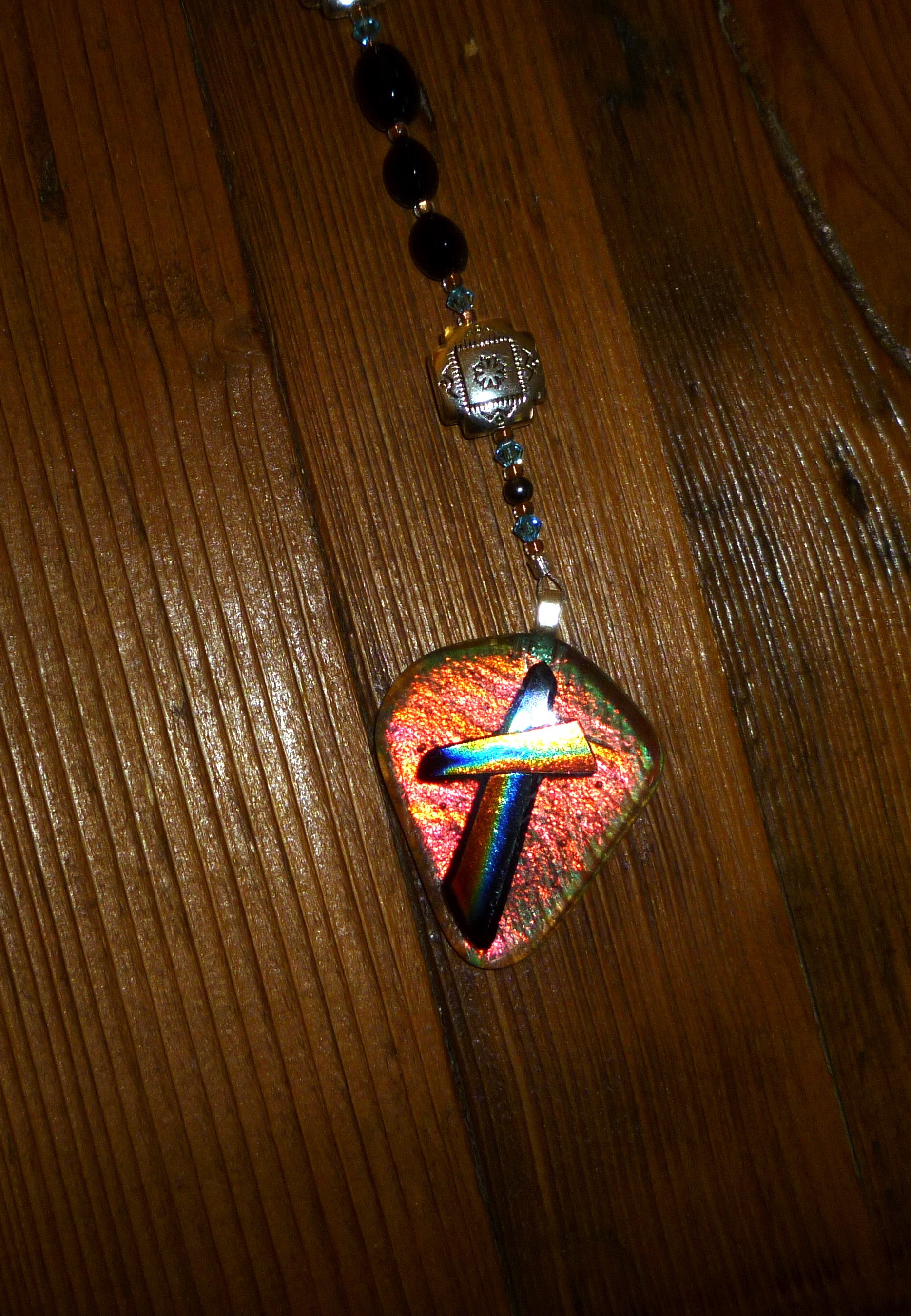 I wish my camera would do justice to those glass crosses, handmade by our extraordinarily talented Doug Thomas. One of them is just amazing: it’s made of dichroic glass. When you lay it down or simply hold it flat and look at it from above, its color appears as this incandescent red-orange flame, with an abstract blue cross over it. Pick the thing up and look at it, and suddenly it’s a sky-blue transparency.
