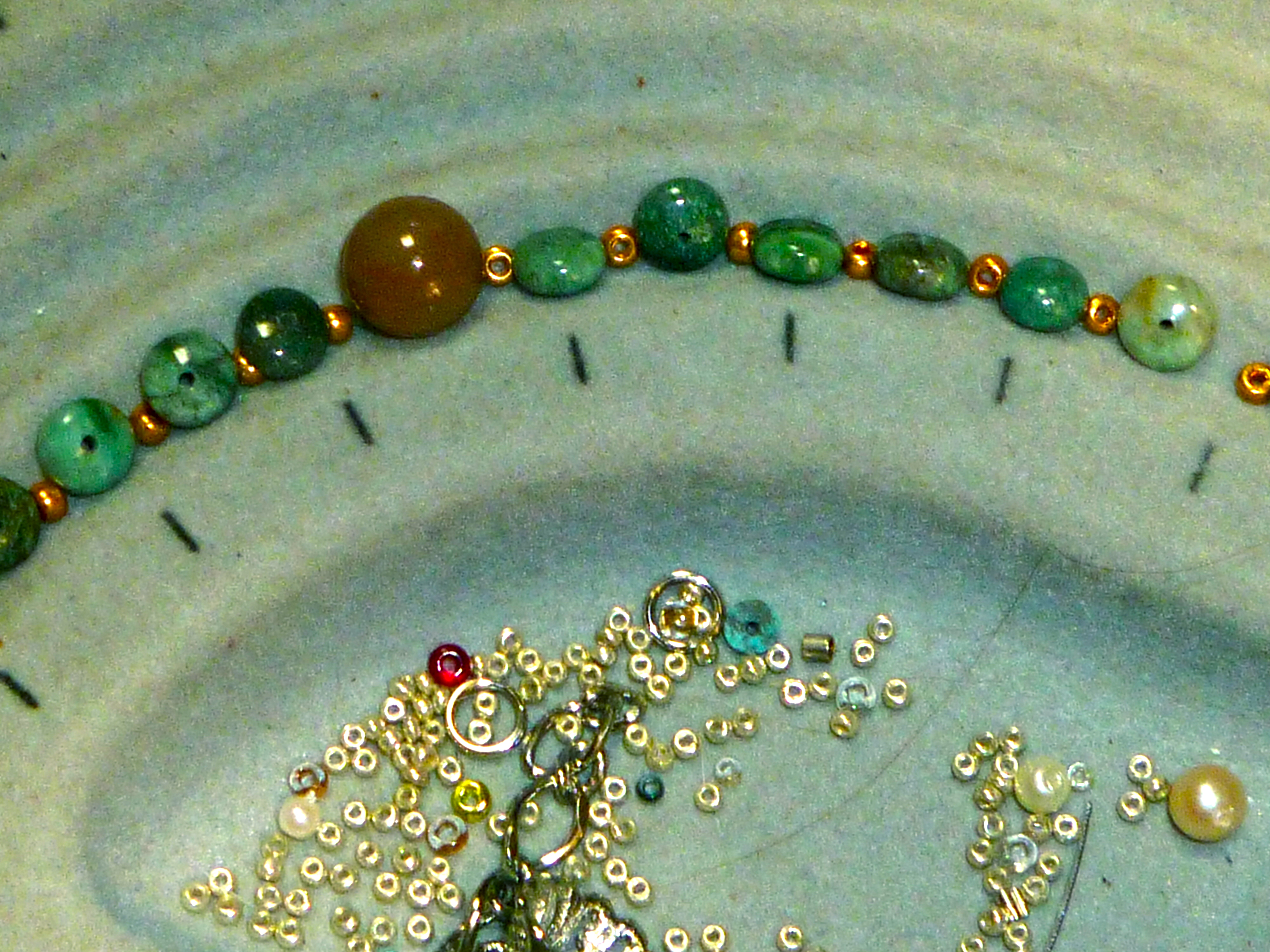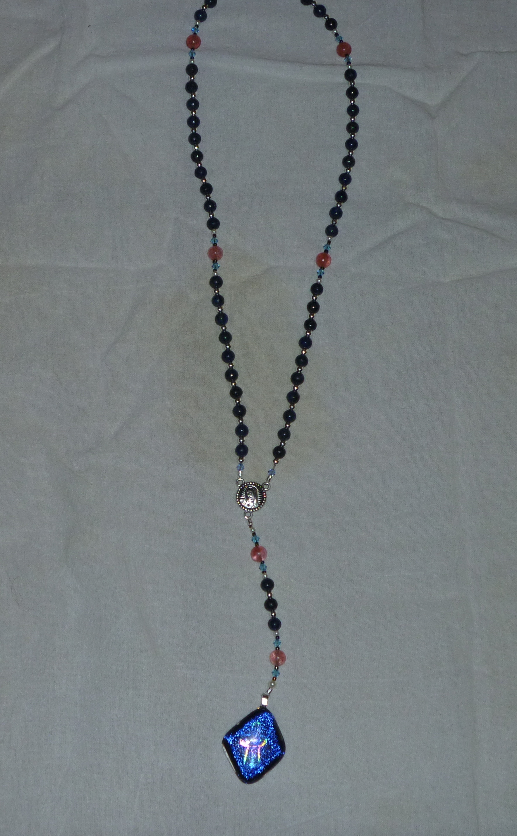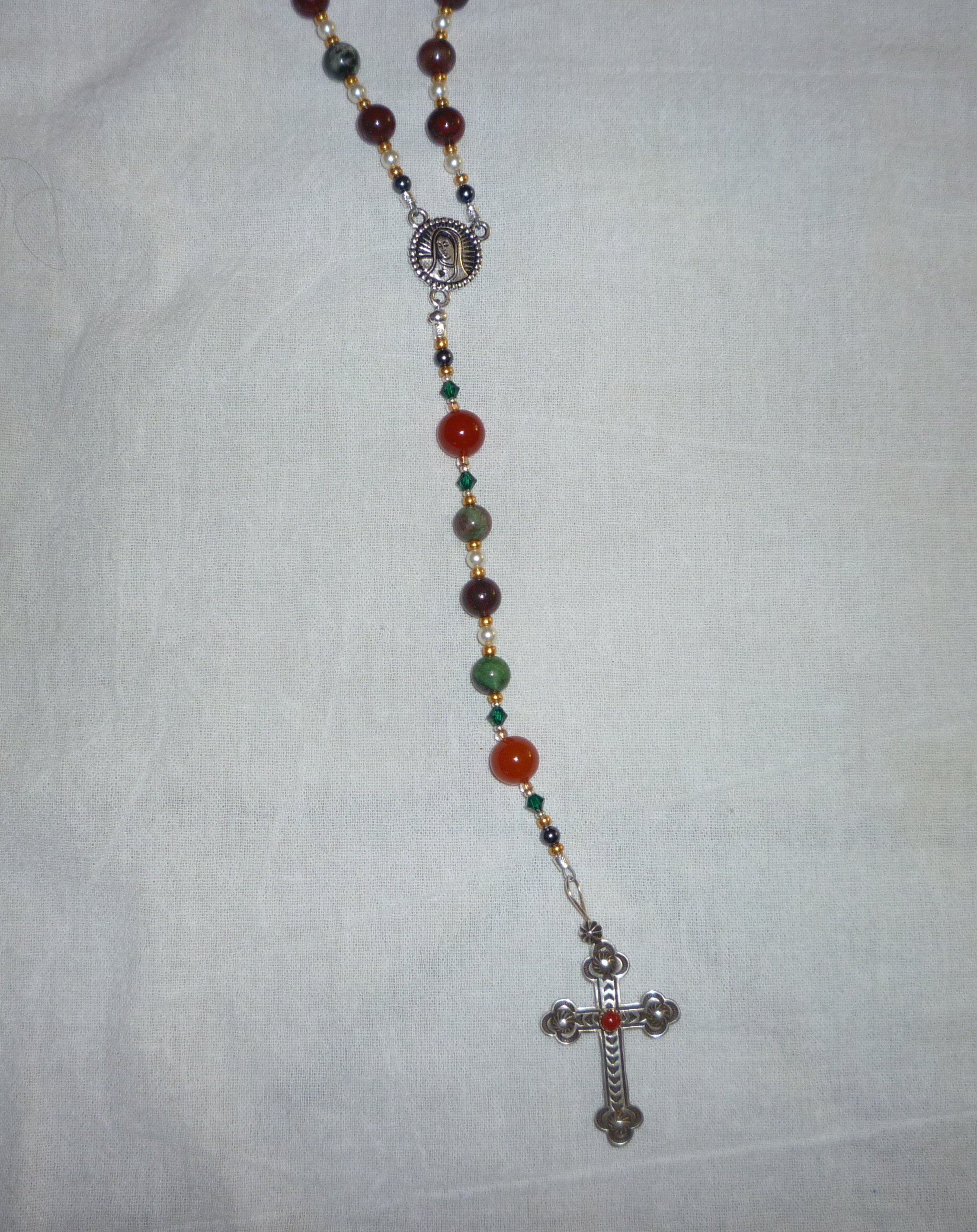 Designing these things is a process of trial and error. I find myself spending a couple days on each one, fiddling with beads and spacers and color combinations and sizes. Just now, I think simplicity is going to be the soul of this particular rosary. At the moment, the proposed combination consists of 10 mm fancy agate (I think that’s what they are) pater beads with 6 mm rondelles of African jade for the decades. The rondelles are separated only by a single gold-colored glass seed bead. I’m not sure that sets them far enough apart for the supplicant to pray on them…but add even a couple of very tiny silver spacers, and they get loosey-goosey and out of proportion.