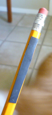 First, get yourself an old-fashioned yellow pencil, the kind that’s milled with six flat sides. Cut off a two-inch-long (or so) strip of rubbery stuff the width of one of these sides. Remove the protective backing and stick it onto the pencil, just below the eraser.