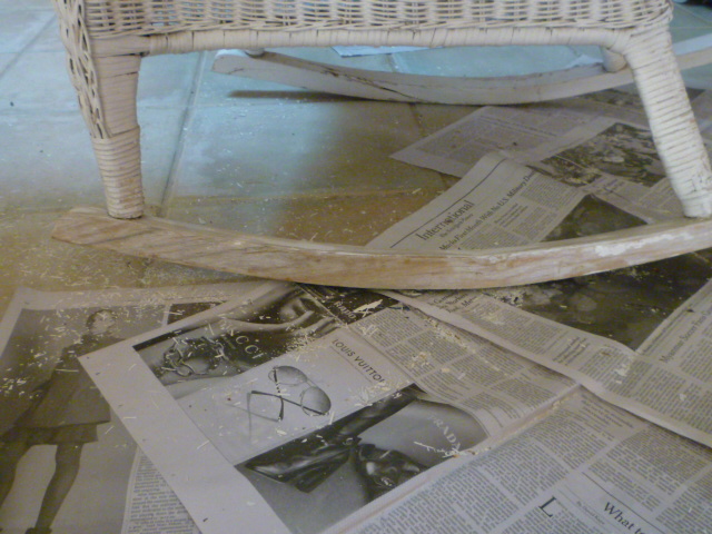 The old Cost Plus rockers are tired, but not beyond resuscitation. So I spent most of the afternoon scraping off peeling paint and sanding.