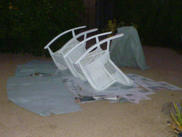 By sundown on Saturday the things were scraped and filled and sanded and dusted as best as one can dust old wicker chairs. In the relative cool of the evening before sundown. I applied one layer of paint to the underside and backs of the chairs. This took the better part of an overheated hour.