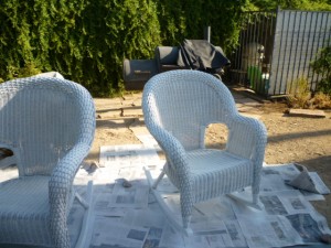 This is either the third or fourth time I’ve painted the damn things. It’s a bitch of a job. It was a bitch of a job eight years or so ago, when I first did it. And each year of advancing age seems to make it more of a bitch of a job. That, truth to tell, is why I wanted to buy new weatherproof fake wicker chairs!!!!! I just didn’t want to do it again.