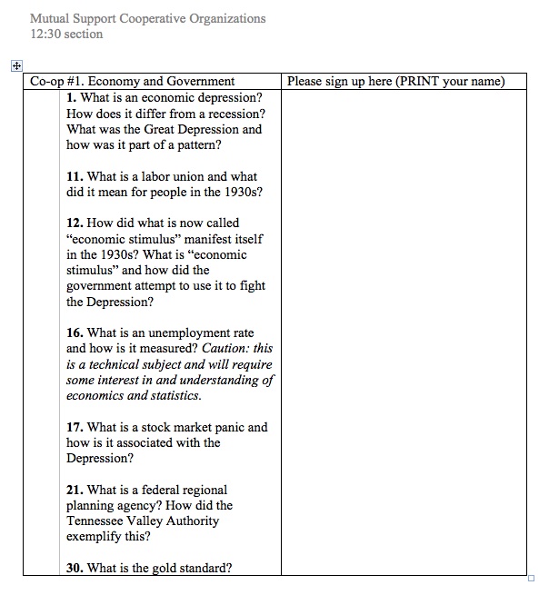 Collaborative groups will go away (another waste of time!), except insofar as we’ll set up informal groups of people with roughly similar topics to function as mutual support groups. In keeping with the Depression-era theme, I’m calling them “co-ops.” They can commiserate with each other, help each other with research (to the extent that they figure out how to do research), and ask each other out on dates.