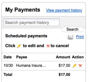 Method #3 is very simple. You get the bill. You navigate online to the credit union bill-pay account you’ve already set up for the creditor. You enter the amount you want to pay and the date on which the creditor should receive it. Et voila! If you have a regularly recurring bill, like that $17 Humana premium in the image above, you can set the thing to pay by the usual due date from now until the end of eternity, and never think of it again.
